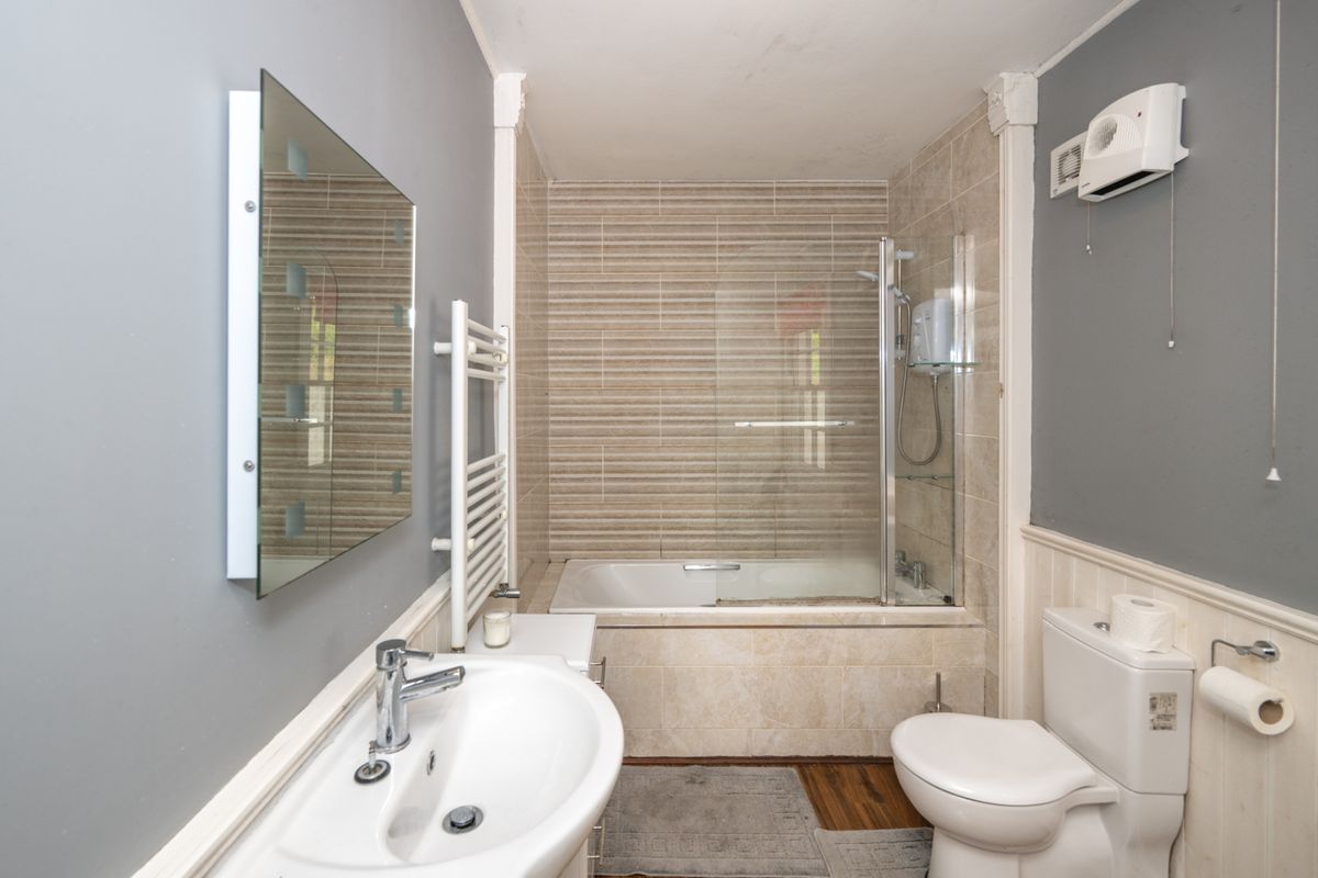 Located at the turn of the stairs, this is a three-piece bath suite with an electric shower over the bath. There is a window to the rear of the home which provides natural ventilation.