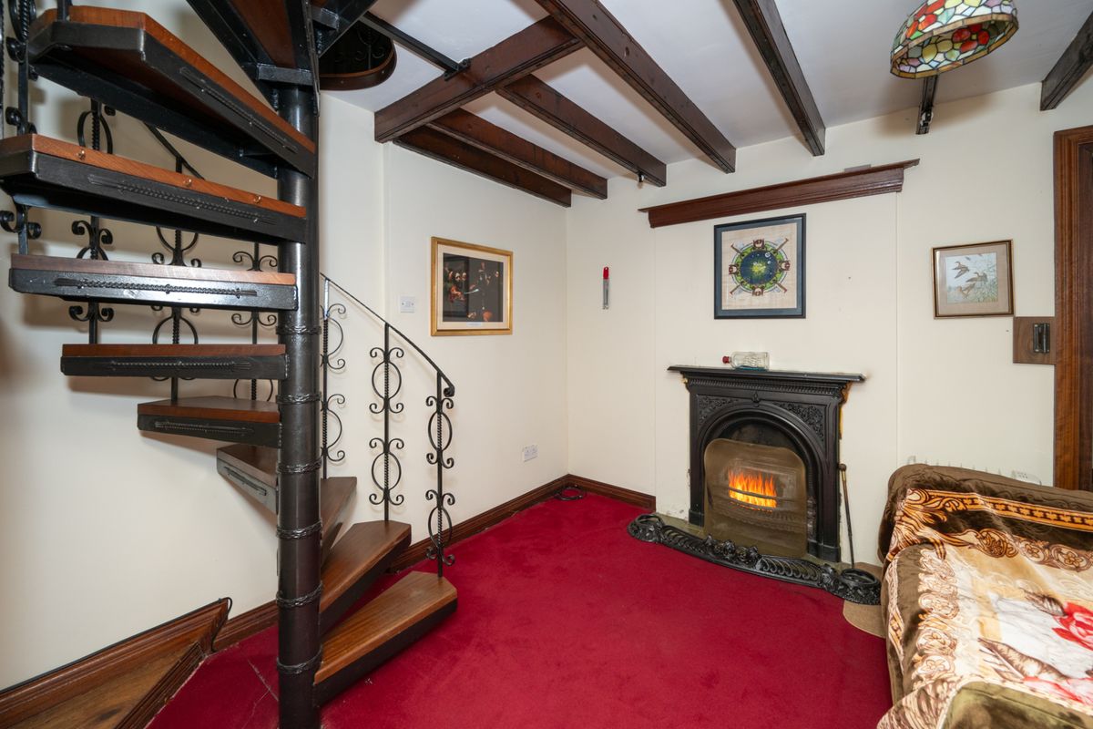 This area is open plan and consists of fitted floor and eye level style units. The kitchen area comprises of an oven, hob, and a fridge freezer under the countertop. The open plan dining/living area is bright and spacious with a large window to the side of the room. It also benefits from an open fireplace with a cast iron surround. The original wooden floor beams are a nice touch to the room which can be seen overhead.