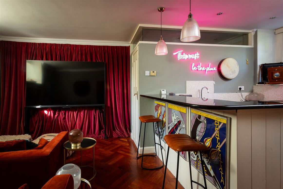 The basement has been thoughtfully renovated to provide versatile living accommodation, ideal for a family member, Au Pair, or home office. A cosy office area welcomes you at the foot of the stairs. To the left, a spacious double bedroom features an exposed original brick wall and an exquisite mantlepiece, while to the right, a multifunctional home cinema room awaits. This space is equipped with a kitchenette, a peninsula island with seating for three, and a bathroom with a toilet, handbasin, and shower. Underfloor heating ensures warmth throughout the basement, enhancing comfort and functionality.