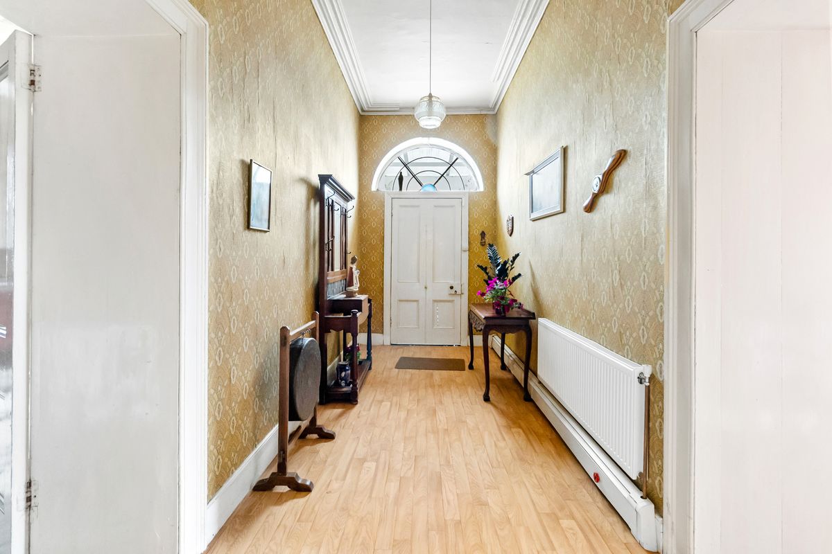 Foyer: Large elegant hallway with laminate wood flooring, coving, panelled front door with fanlight window above.