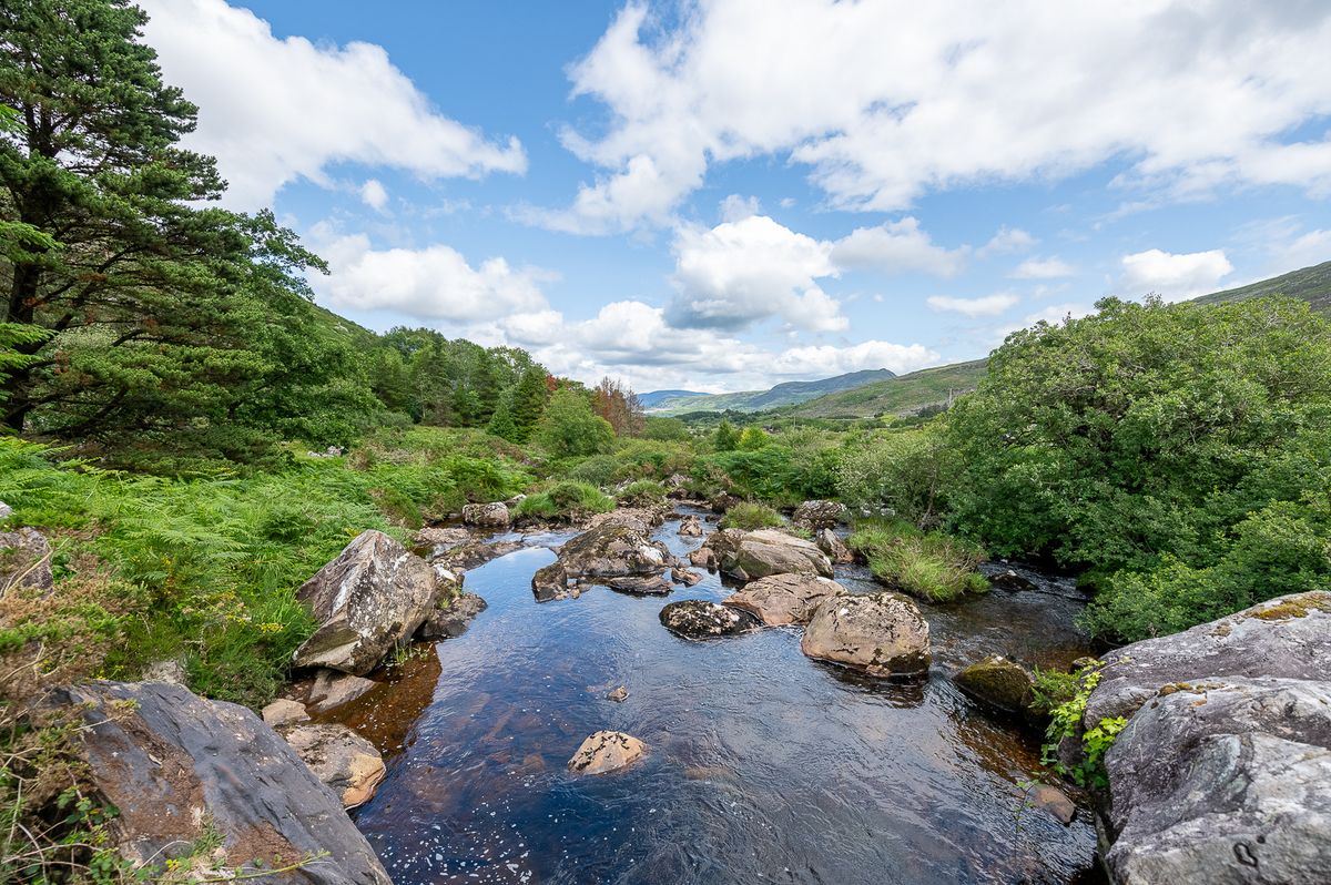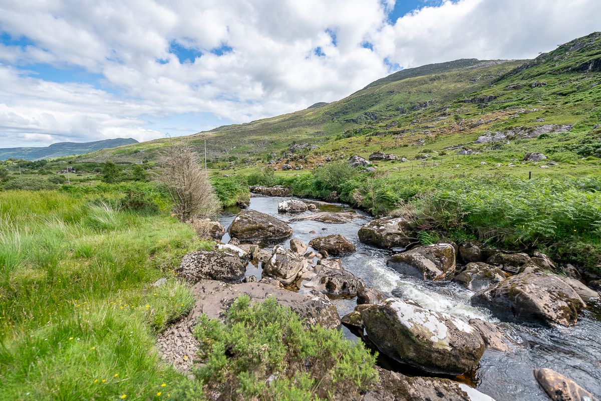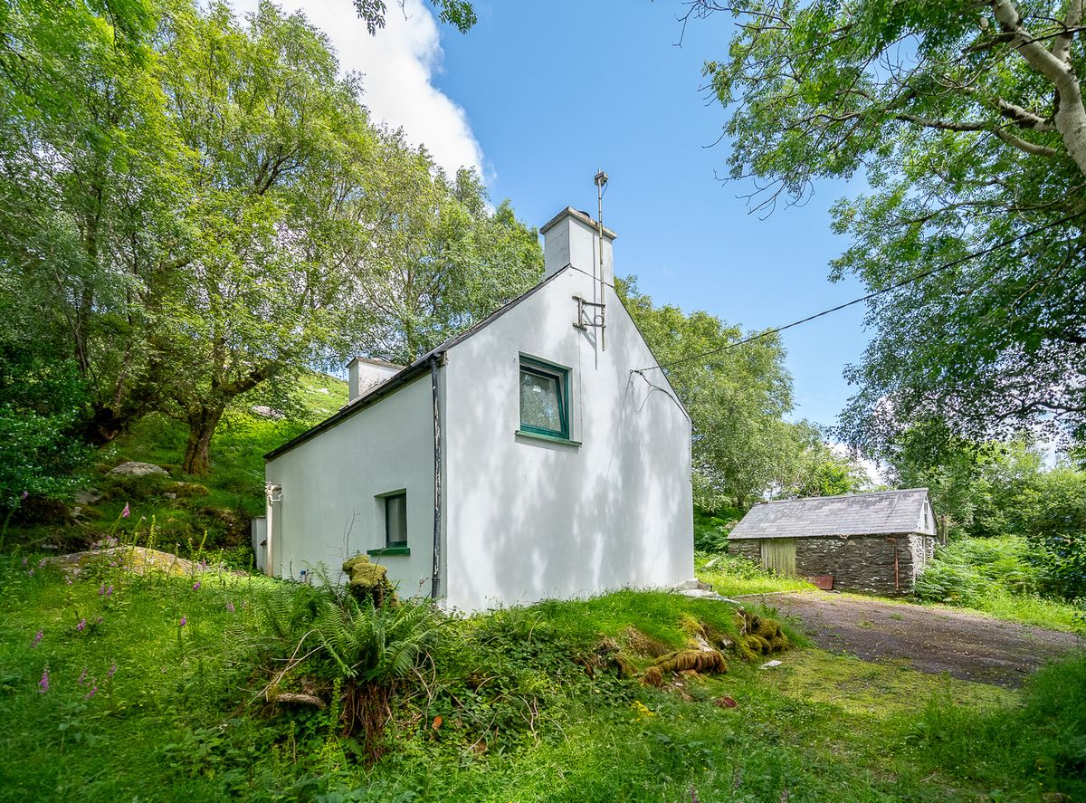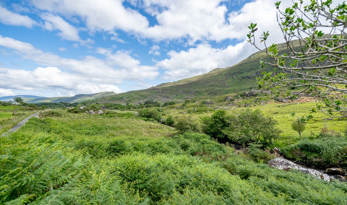 Set on 6.5 acres (2.63 hectares) of mixed river meadow and grazing in the remote and magical Black Valley, Co. Kerry, this cosy farmhouse nestles in the friendly arms of the MacGillycuddy’s Reeks range of mountains at Graignagreana in the far West of Ireland. The River Owenreagh wanders through the southern border of the property, offering extensive river frontage and a natural “secret” swimming pool completely hidden from the road and fed by a waterfall.