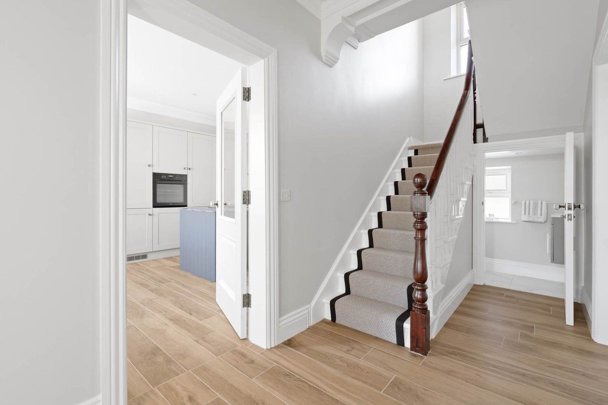 The original period staircase with a beautiful new carpet runner, leading to the first-floor landing area. Filled with generous amount of natural light, due to the high ceilings and large windows. The first floor also has air to water and contemporary energy saving aluminium radiators.