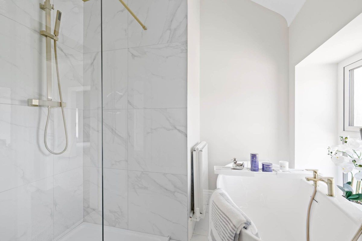 First floor main bathroom: Contemporary tile flooring and a contemporary white three-piece suite. There is a free-standing feature bath, with brass fittings. Separate shower cubicle with brass fittings and a mains power shower. The contemporary wash hand basin has storage below and above, an electric mirror has been installed which has sensor lighting and a heated towel rail.