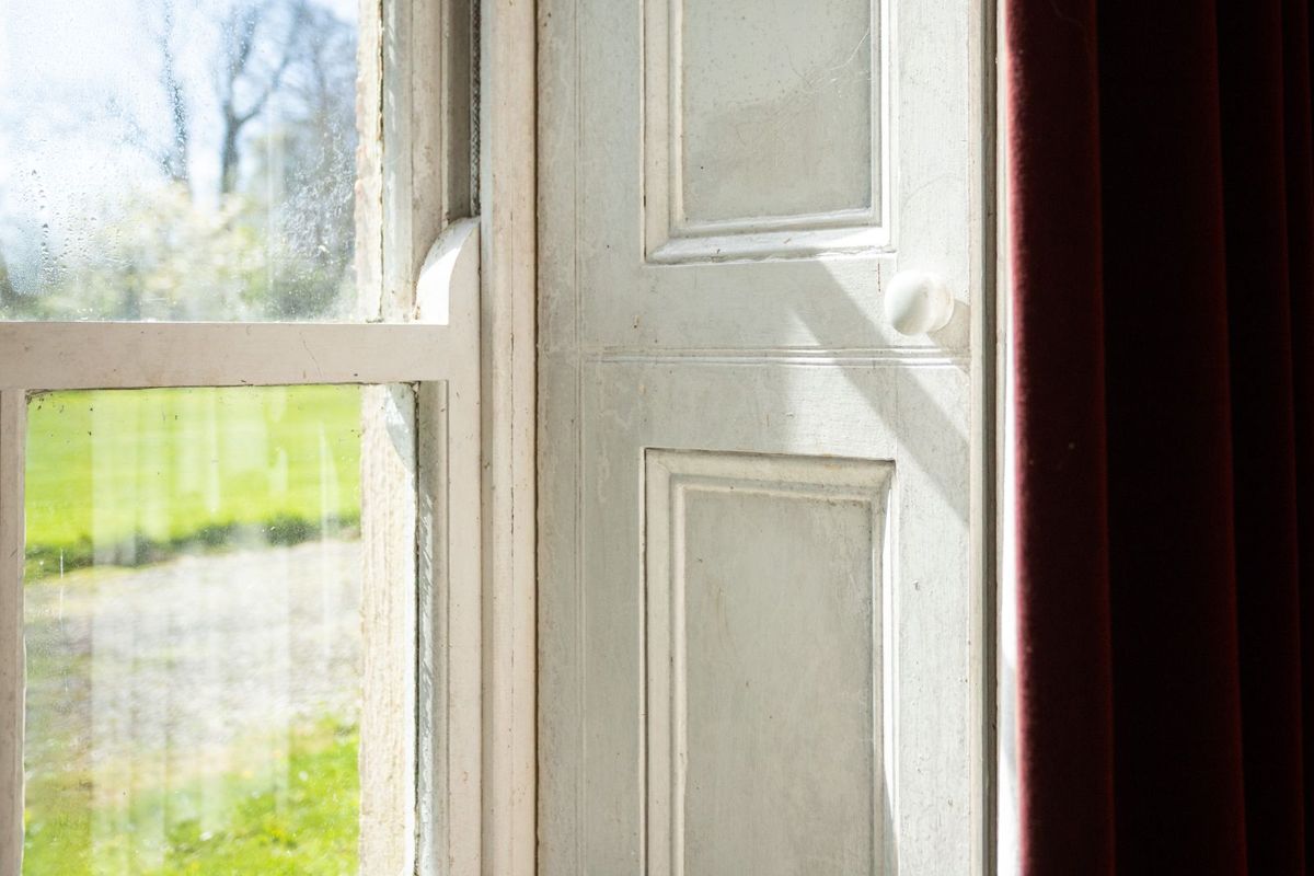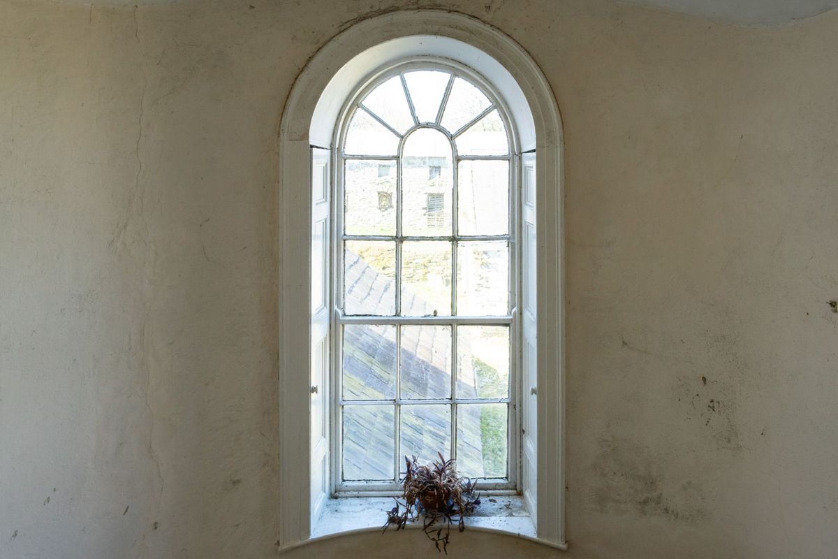 The house is a textbook example of Georgian architecture, with its traditional slate roof, tall chimneys, and elegant timber sash windows six-over-six panes on the upper level and grander nine-over-six panes below, each set on carved stone sills. A graceful fanlit arched sash window illuminates the return staircase, while the front door is framed by an exquisite neo-Classical doorcase with fluted pilasters, sidelights, and a decorative fanlight that fills the generous reception hall with natural light.