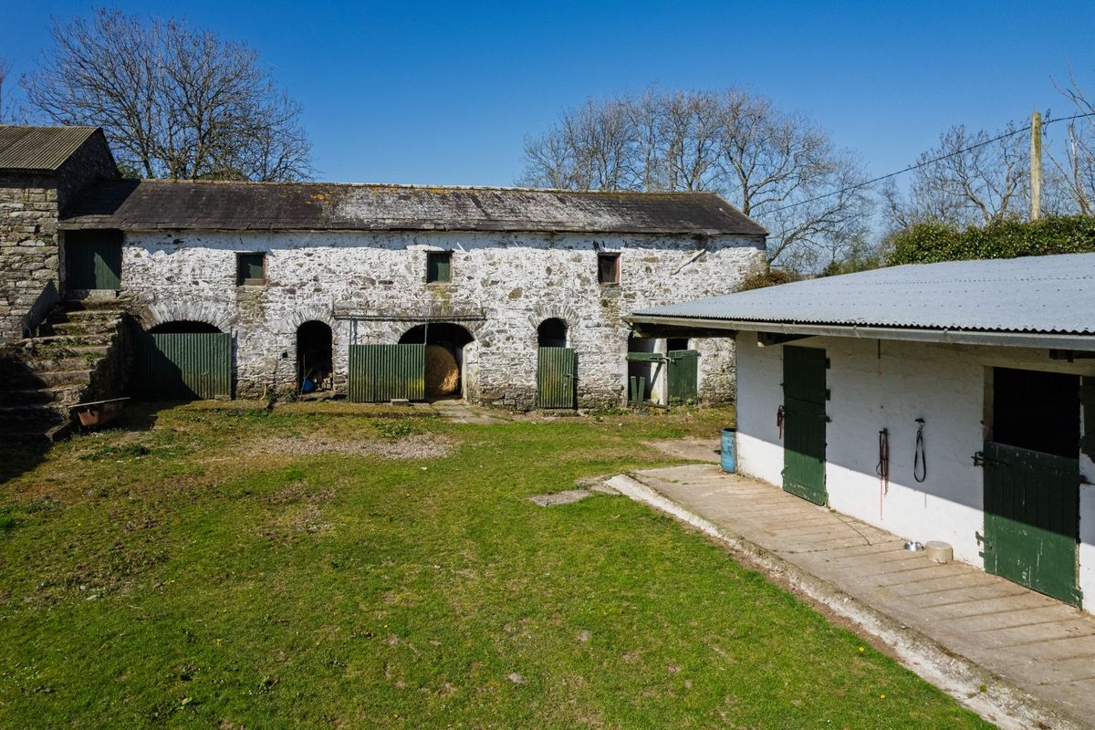 To the rear of the house lies a remarkable collection of traditional stone outbuildings, all under slate, offering extensive storage and conversion potential. These include a range of stables with water and electricity laid on, original carriage houses with arched openings, and a grain store retaining its historic milling hopper. A large hay and straw barn complete the outbuildings, adjacent to an enclosed paddock ideal for equestrian or agricultural use. A central turning circle, once used for pony and trap, remains a nod to the property’s rich equestrian past.