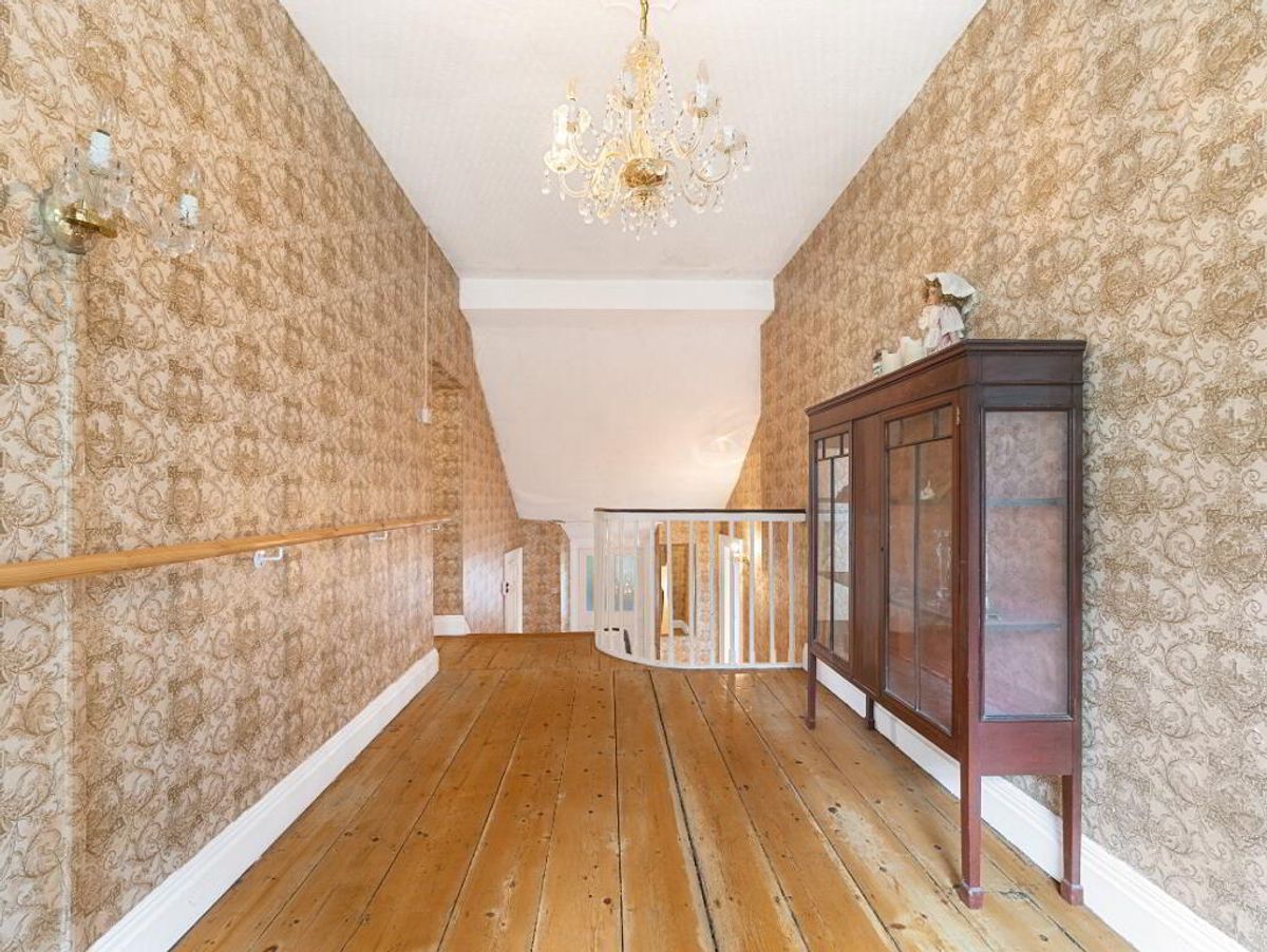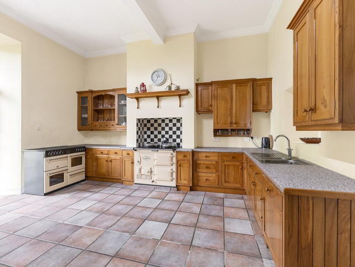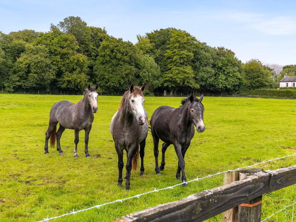 The property includes a charming two-storey Georgian-style farmhouse, approached via a sweeping entrance set back from the public road. A number of traditional stone-built out offices and a range of older farm outbuildings accompany the residence. The holding, currently in grass, is well laid out in large, easily managed fields.